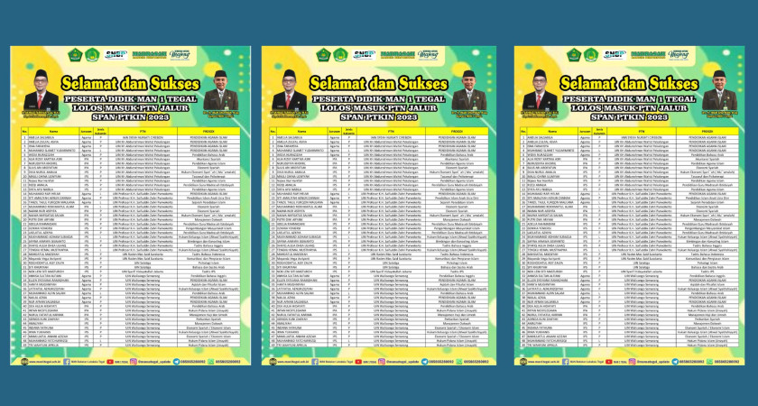 Umumnya mereka mengungkapkan impian bisa diterima di perguruan tinggi negeri yang sudah dicita-citakan. Setelah melewati penantian yang cukup menegangkan, akhirnya sebanyak 49 Peserta Didik MAN 1 Tegal yang sebelumnya mendaftar via online Seleksi Prestasi Akademik Nasional Perguruan Tinggi Keagamaan Islam Negeri (SPAN-PTKIN) dinyatakan lolos.