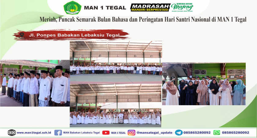 (Slawi) – MAN 1 Tegal melaksanakan Upacara dalam rangka memperingati Hari Santri Nasional 2022. Hari santri ini merupakan hari santri ke 8 sejak ditetapkan pada 22 Oktober 2015. Kepala MAN 1 Tegal Imam Shofwan bersama civitas academica melangsungkan upacara HSN di lapangan Indoor, pada Sabtu (22/10).