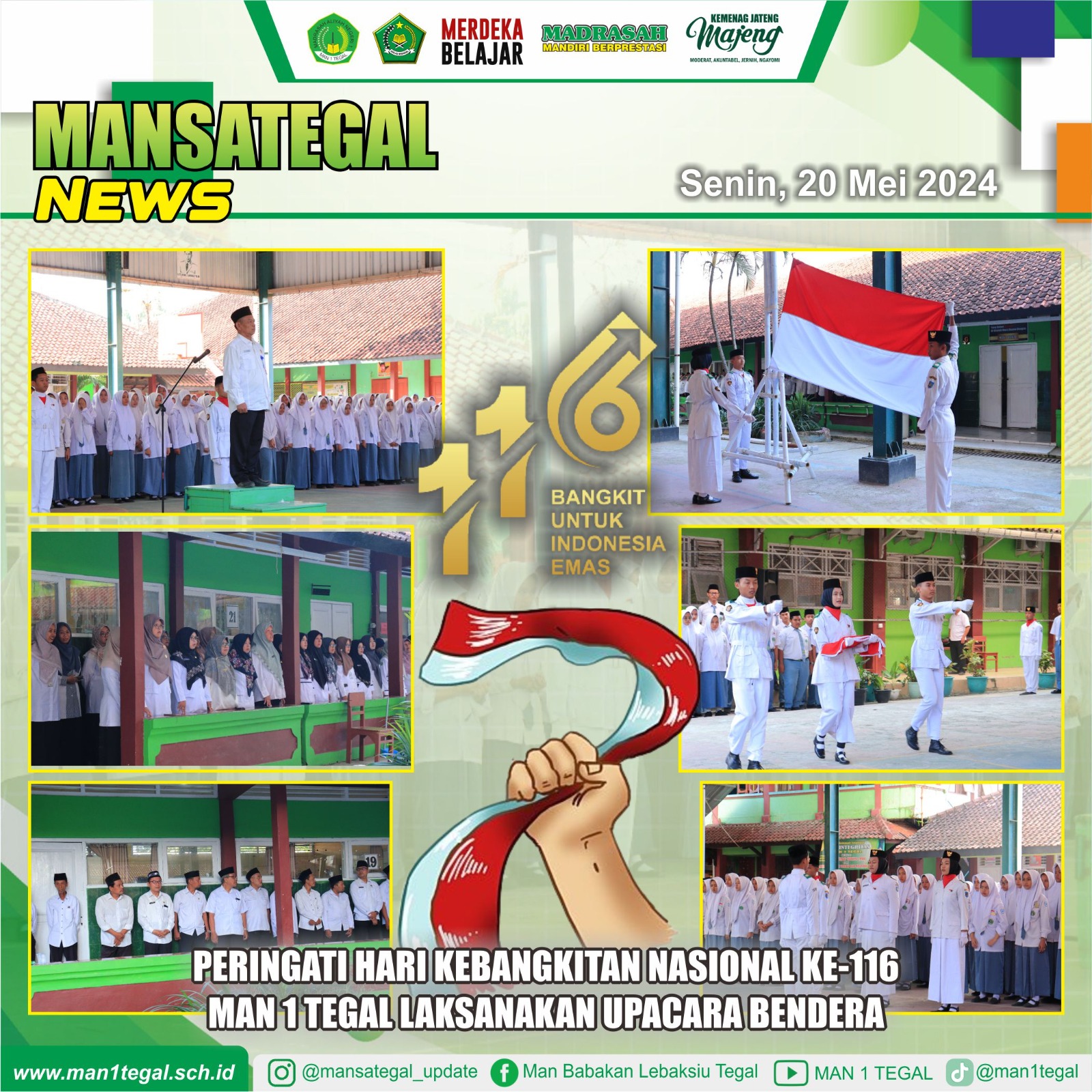 Slawi – Madrasah Aliyah Negeri (MAN) 1 Tegal  menggelar upacara bendera dalam rangka memperingati Hari Kebangkitan Nasional di Indoor madrasah yang di ikuti seluruh peserta didik, Bapak/Ibu guru, Senin (20/5).
