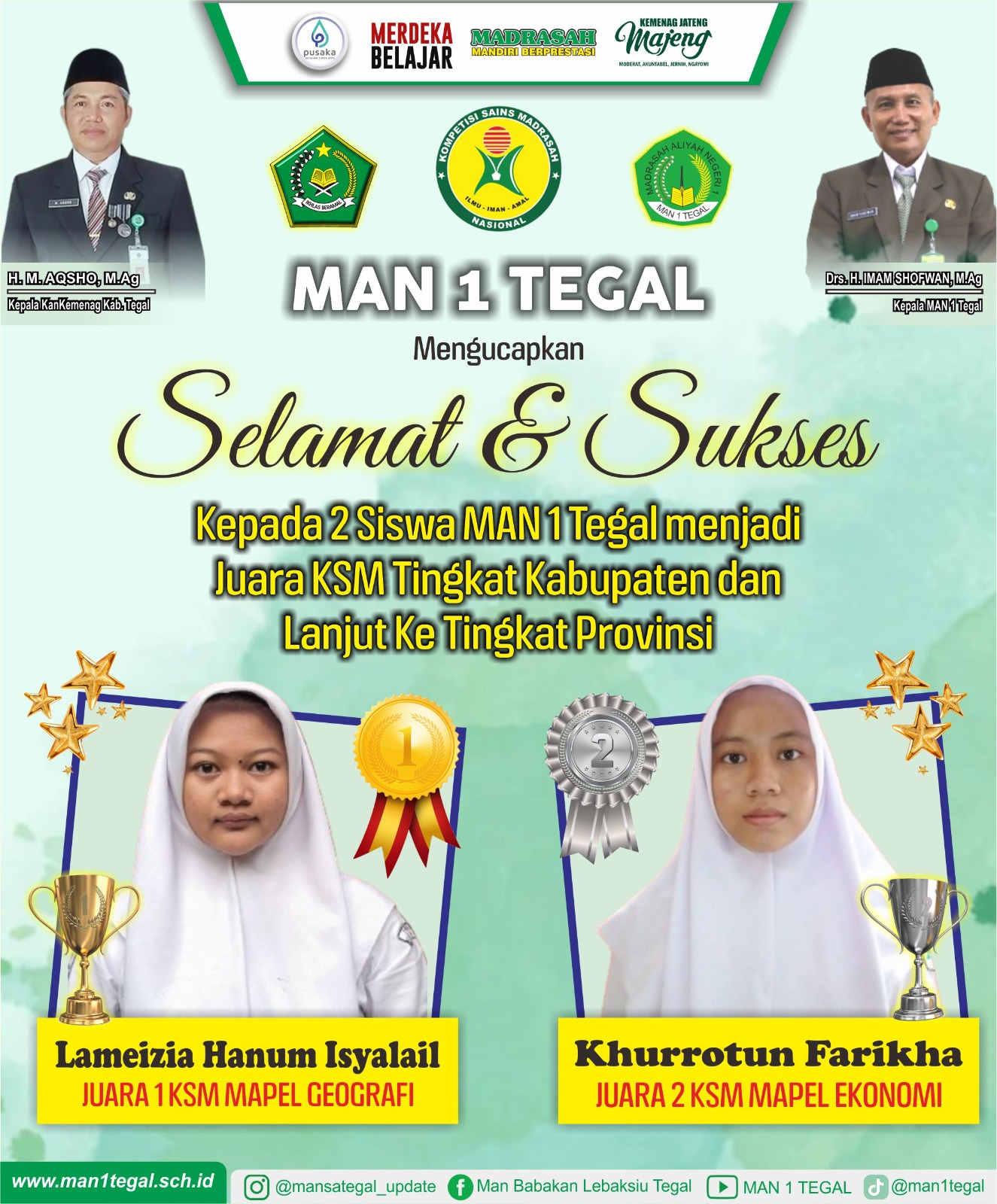 Slawi – MAN 1 Tegal meraih 2 cabang lomba dari 6 cabang KSM yang dilombakan. Mata pelajaran yang dilombakan pada KSM tingkat Kabupaten/Kota ada enam mapel diantaranya (Matematika, Biologi, Fisika, Kimia, Ekonomi dan Geografi). Pelaksanaan KSM menggunakan mode daring dan dibagi menjadi tiga sesi.