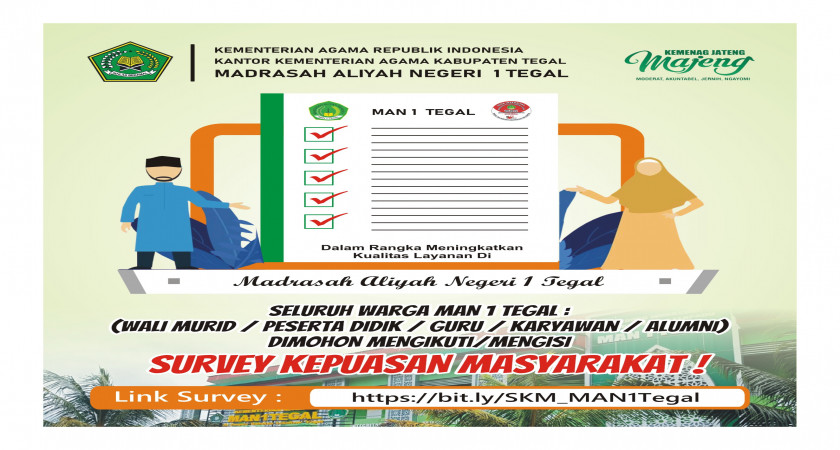 Dalam rangka meningkatkan kualitas layanan di MAN 1 Tegal, dimohon kesediannya untuk siswa, alumni, wali murid dan bapak/ibu guru MAN 1 Tegal untuk mengisi / mengikuti Survey Kepuasan Masyarakat melalui _link_ berikut :