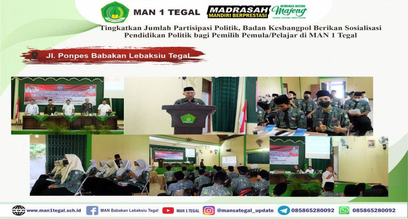 Badan Kesatuan Bangsa dan Politik (kesbangpol) Kabupaten Tegal melaksanakan Kegiatan Sosialisasi Pendidikan Politik bagi Pemilih Pemula/Pelajar di MAN 1 Tegal. Kegiatan sosialisasi ini dilaksanakan di Aula An-Nur, Rabu (29/6).